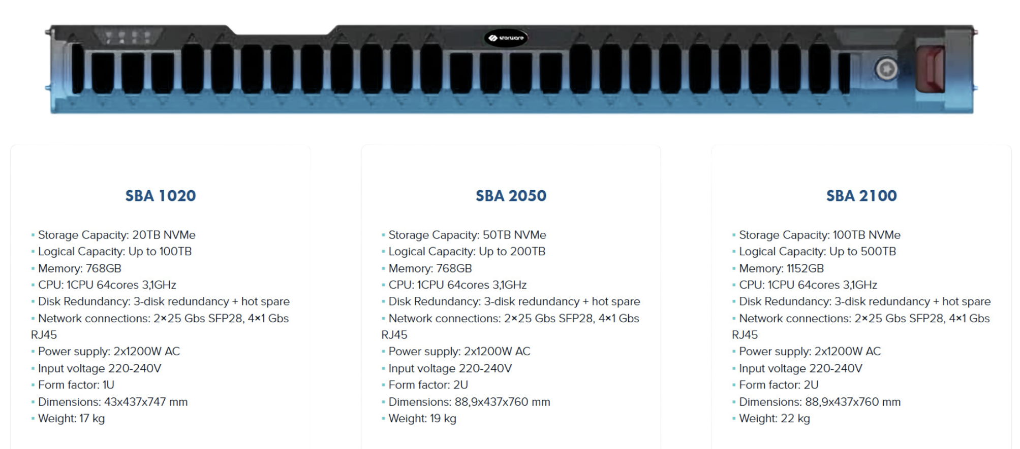 Storware Backup Appliance is available in three variants: SBA 1020 (maximum capacity 100 TB), SBA 2050 (up to 250 TB), and SBA 2100 (up to 500 TB). The solution not only secures data but also ensures its efficient storage. Thanks to ZFS deduplication, it’s possible to achieve up to 5:1 space savings. Backups are created synthetically, and the appliance’s architecture allows for efficient operation even under heavy load—the only potential bottleneck might be the client’s network infrastructure. Expected performance is approximately 0.5 TB per hour for a 64 KB block or 7 TB per hour for 512 KB.
