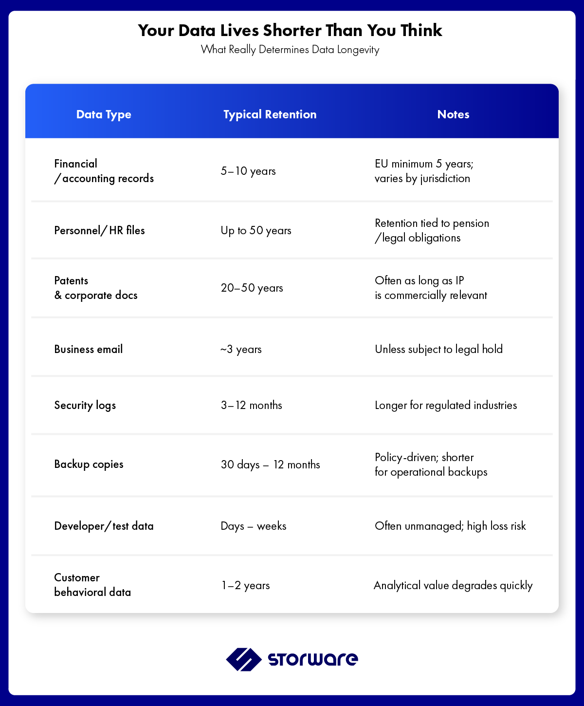 Data retention in organizations is not a single number — it is a spectrum that stretches from weeks to half a century. Financial records in the EU must survive a minimum of five years; personnel files up to fifty. Patents and corporate governance documents can span decades. Business emails average around three years. Security logs and backup copies are typically retained for just a few months, while developer scratch data often lives no longer than a few weeks.